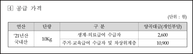 지원대상은 정부양곡을 직접 이용을 목적으로 구입을 희망하는 기초수급자및 법정 차상위계층 대상자 가구입니다.