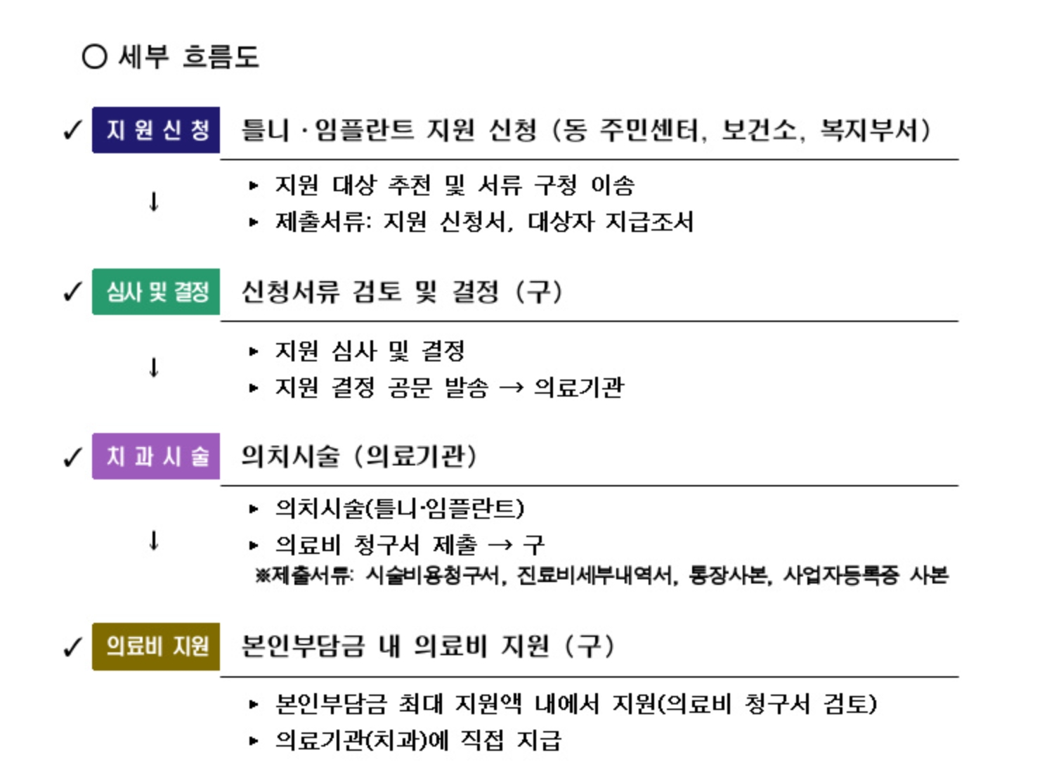 - 기존 정책으로는 만 65세 이상의 의료급여 수급권자 이면서, 치과, 병.의원에서 시술전에 국민건강보험공당 등록시스템을 통해 직접 또는 신청서를 관할 시군구청 또는 읍면동에 방문하여 제출하신분지원합니다.