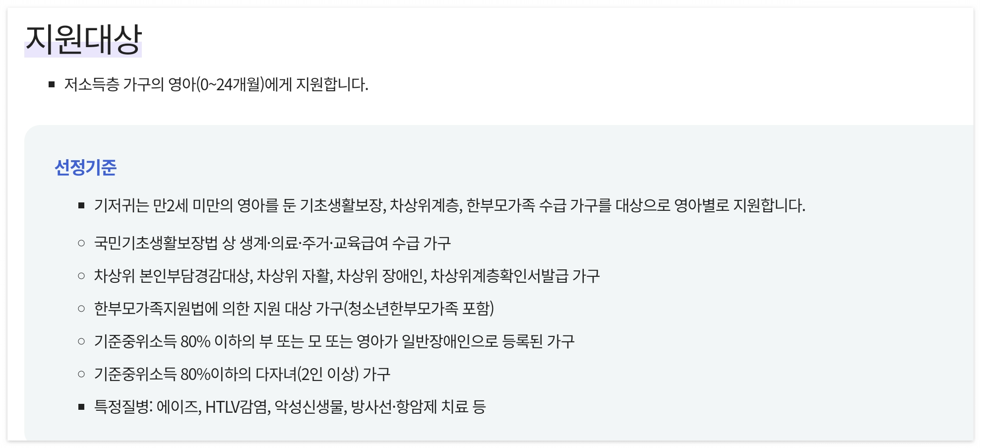 두번째는, 기준중위소득 80%이하이면서 부모 또는 아이가 장애인이거나