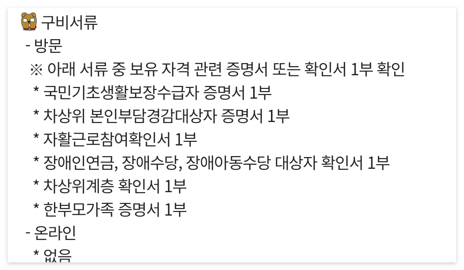 복지로에서 온라인 신청을 하게 되면 따로 서류를 제출할 필요가 없고 신청방법도 아주 간단하기 때문에 온라인 신청을 추천드립니다.