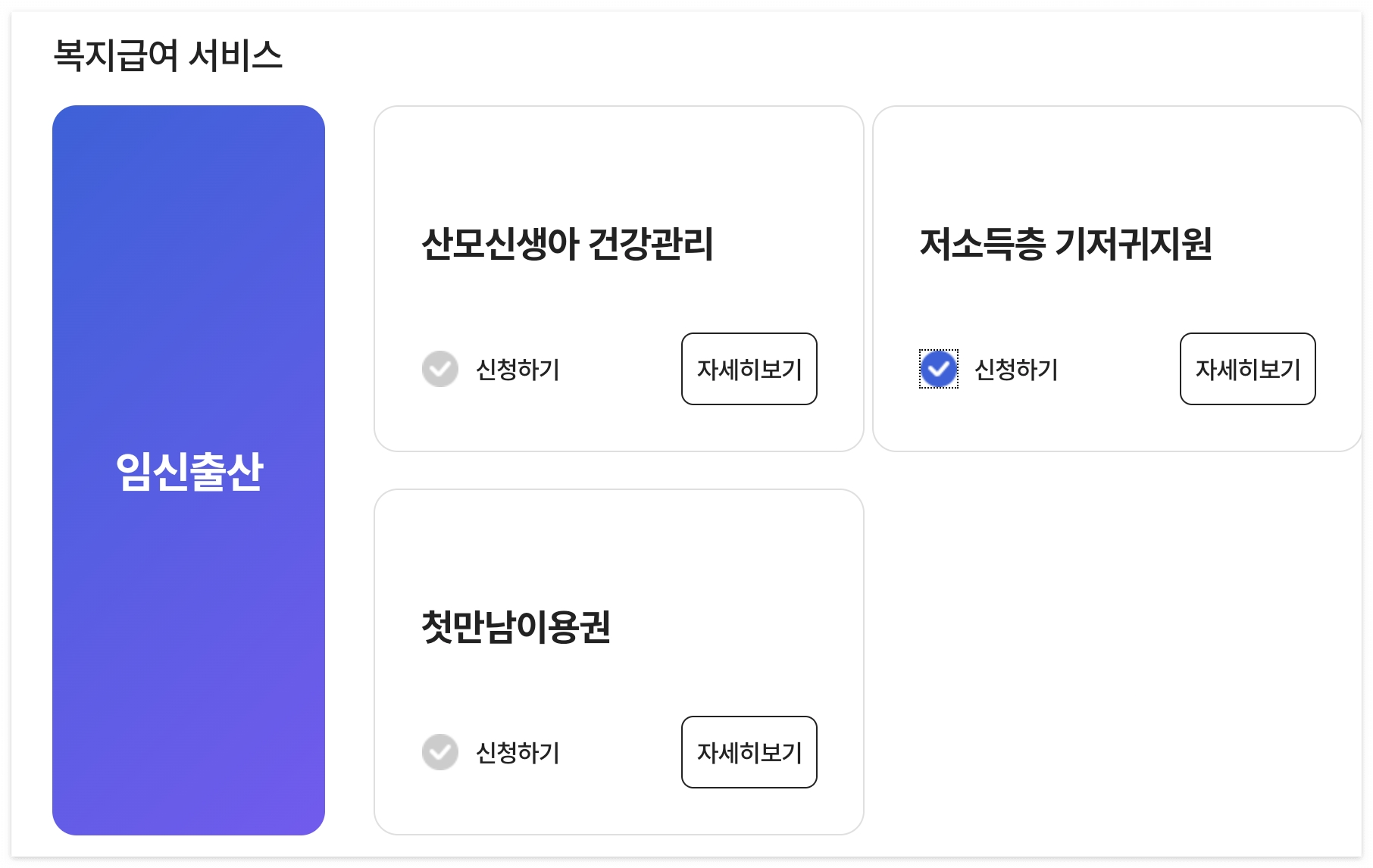복지급여 신청에 임신출산 목록에 저소득층 기저귀 지원을 신청합니다.