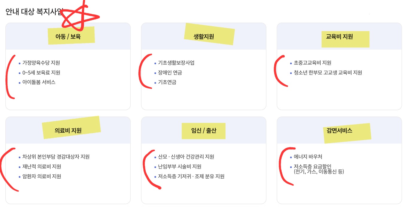 아동/보육, 생활지원, 교육비 지원, 의료비 지원, 임신/출산, 감면서비스로 나눠집니다.