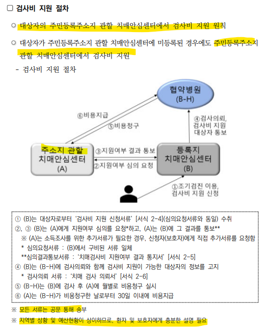 대상자의 주민등록주소지 관할 치매안심센터에서 검사비를 지원합니다.